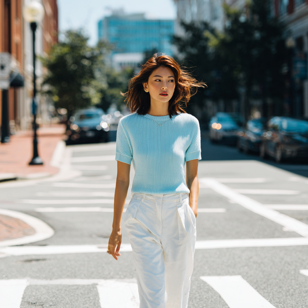 - 구성: 소라색 반팔 니트 + 화이트 스트레이트핏 코튼 팬츠