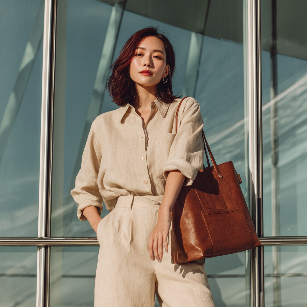- 구성: 연베이지 린넨 셔츠 + 같은 톤의 하이웨이스트 린넨 팬츠